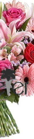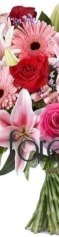 6 x Pink Stargazer Lilies, 4 x Hot Pink Roses, 4 x Red Roses, 4 x Pink Gerbera, Pink Alstroemeria